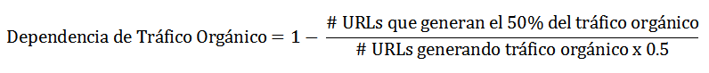 Un KPI SEO interesante que se puede conseguir con Google Analytics es medir el porcentaje de URLs que generan el 50% del tráfico orgánico dividido entre el total de URLs recibiendo tráfico orgánico. La formula para calcular esta métrica SEO con Google Analytics es la siguiente.